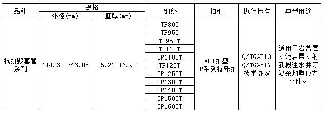 天津大無縫鋼管廠開發的抗擠毀系列套管具有比API Spec 5CT同規格、同鋼級套管更高的抗擠毀性能,適用于鹽膏層、泥巖層以及油層出砂等特殊井況,抵抗極大外擠載荷或不均勻外擠載荷。TP系列高抗擠毀套管包括三個種類,一是API Spec 5CT標準規格系列的高抗擠毀套管;二是具有特殊通徑要求的API Spec 5CT規格高抗擠毀套管;三是適用于巖鹽層、鹽膏層、泥巖層等復雜井況的非API規格系列的超高強度高抗擠毀套管。