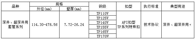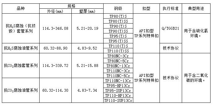公司擁有當今世界先進的包括原料海綿鐵、煉鋼、軋管、鋼管精整加工等工序在內的石油套管生產線。公司可生產API系列所有鋼級,近年來還根據市場的不同需求,研制開發了多種非API標準的石油套管,形成了自己的TP產品系列,豐富了國產石油套管的規格品種,為不同的使用需求,提供了多樣性的選擇。