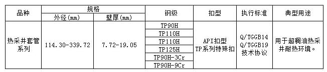 天津大無縫鋼管廠根據注蒸汽、蒸汽驅稠油熱采工藝,設計開發了TP系列稠油熱采井專用套管,有效提高了注蒸汽作業溫度下套管的屈服強度,保證了管串在高溫下的密封性能。同時,針對近年來火驅采油工藝的逐漸推廣,天津大無縫鋼管廠設計開發了90ksi和110ksi高鉻(Cr)系列熱采井套管。該系列套管產品具備更加優異的高溫強度穩定性及抗二氧化碳腐蝕能力,專門應用于火驅采油工藝,目前已經在新疆油田得到廣泛使用。