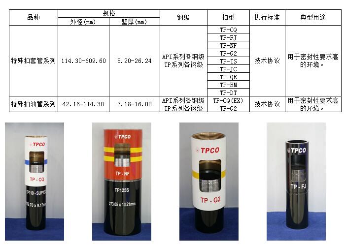 天津鋼管鋼管廠自2001年與中國石油長慶油田合作開發出TP-CQ特殊螺紋形式后,目前已先后開發出十余種特殊螺紋類型,形成了TP系列油套管特殊螺紋。其中TP-TS和TP-JC均采用螺紋氣密封結構,已獲得國家和國際發明專利。TP-CQ特殊螺紋通過了英國OSI(NAMAS)實驗室、中國石油鋼管廠石油管工程技術研究院(TGRC)和阿聯酋ADCO等評價試驗。